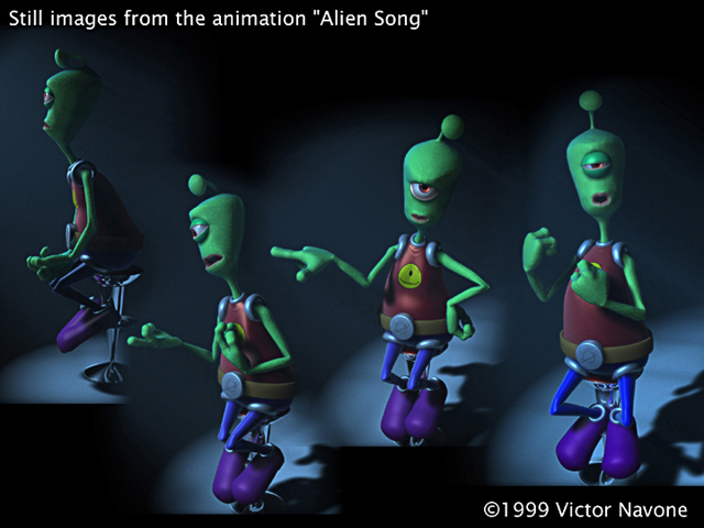 After more constraint revisions and the addition of a shirt, Blit was ready to move on. I figured it was about time I tackled lip-synch so I began to look for interesting audio sources. I didn't want to use my own voice because I don't like the way my voice sounds in recordings, and I don't think that Blit would sound like me anyway. I was considering a William Shatner bit or quotes from some of my favorite movies when, at my wife's office Christmas party, the DJ put on Gloria Gaynor's "I Will Survive". I was immediately struck with the image of Blit emoting on a stool under a blue spotlight. I'm not a big fan of disco, but I thought the song had some interesting emotional transitions and a narrative that would lend itself well to animation. The combination of Blit and "I Will Survive" is incidental. Blit was the only character I had setup and ready to animate, and I thought the song was good for lip-synching in its own right. The line in the song about "outer space" was just a lucky coincidence. There's really no other justification as to why a dorky green alien is singing like a black diva, but I think this absurdity is somehow working in favor of the animation. My only concern is that people might think that Blit's personality is that of a diva, when in actuality I think of him more as he appeared in "Alien Test": goofy and vulnerable.
