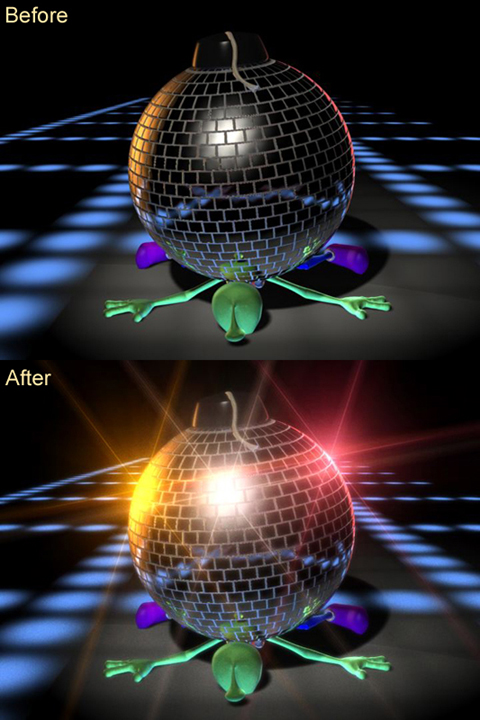 This animation was created both on the Mac and PC, and the final frames were rendered at D1 resolution (720 x 486 with pixel ratio of .9) and sampled down for the web version. I also did plenty of post-processing in Adobe After Effects as I always will, given the chance. I softened the images, added some bloom and film grain, made sure the colors were safe for broadcast and created the sparkles on the disco ball with Knoll Lens Flare Pro.
