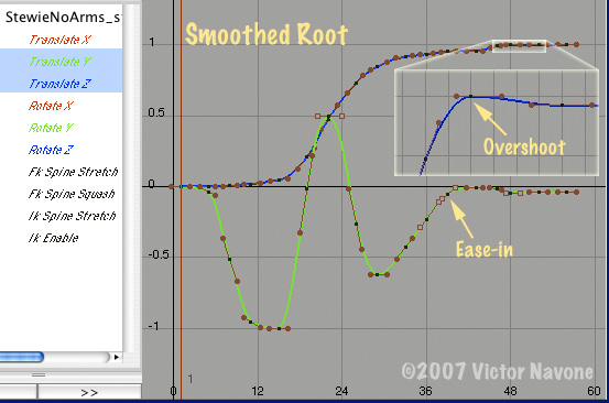 Smoothing the Root: Looking at the translation splines for the hips there are some obvious places that need smoothing, such as the big Y Translation arc of the jump. I can also add more eases and push the existing eases a little further. Near the end of the animation where he stands up I neglected to add an ease-in breakdown. Not to worry; I can add this ease directly in the spline editor. In the animation below notice how much the arcs and spacing in the hips have improved. I also added a slight overshoot to the Translate Z spline on frame 48 to make the hips overshoot forward when he looks back. Roll-over the image below to see "before" and "after".